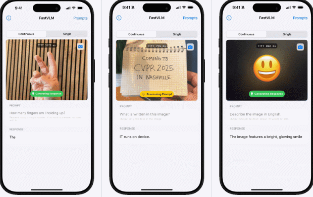 With this approach, it is possible to output fewer tokens and significantly reduce encoding time for high-resolution images. A sample app is available that shows how this model can answer visual questions on mobile devices. FastVLM runs on iOS (18.2+) and macOS (15.2+). The app has a set of prompts that you can use to get started faster.