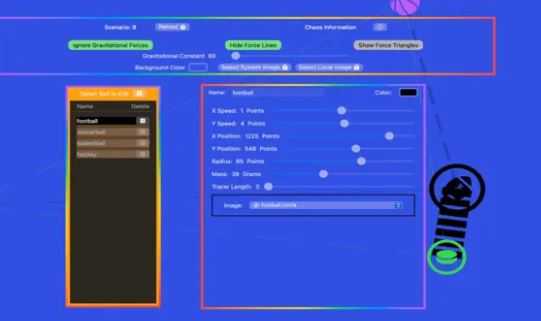 This app is highly customizable. You can change background color and even upload a PNG image from your own device to change the background. You can save scenarios to repeat experiments in the future.