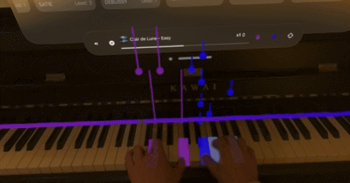 Piano Flowing Tiles: an interactive piano app for Vision Pro that turns playing into a game-like experience. It comes with a wide range of piano pieces for you to try. You adjust the tempo to play at your own speed. It is compatible with standard-size pianos.
