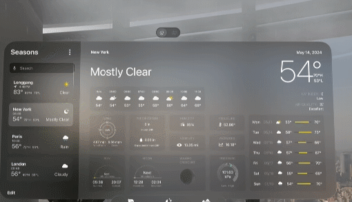 Seasons: another gorgeous weather app for the Vision Pro that helps you almost feel the changes. It supports minute to day-level forecasts. It shows wind, air quality, precipitation, moonrise/moon set and sunrise/sunset times. It has 34 gorgeous weather conditions with spatial audio. You can choose temperature, precipitation and cloud cover map tiles.