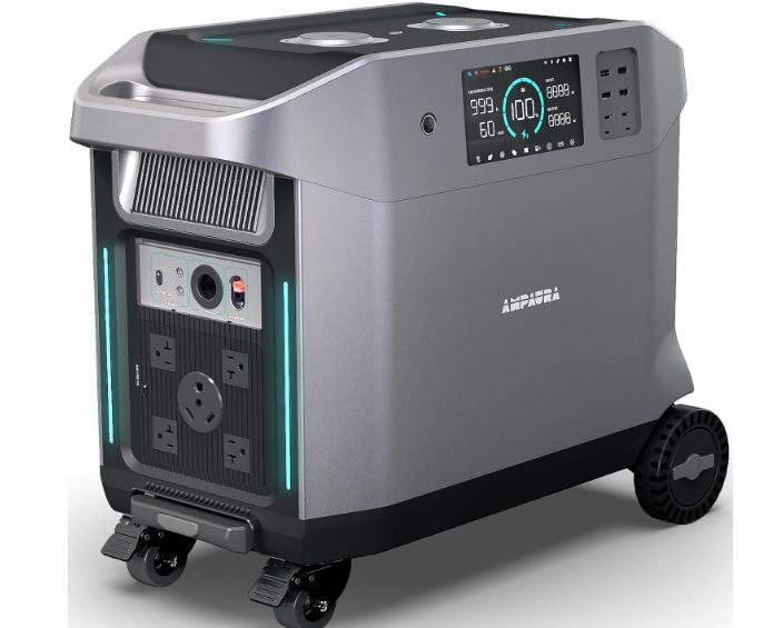 Expandable power stations are handy for those of you who have a lot of essential devices that you need to keep going in case of a power outage. The AmpAura Purea 3 is one with a 3600 AC output, expandable to 38.4kWh. It supports up to 9 expansion batteries. It has a total of 17 ports and wireless charging capability. This power station also has a mBoost mode for short bursts.