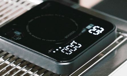 This mini espresso scale can display flow rate and weight or time & weight. In automatic mode, it will  tare when you place a cup. This mini espresso scale has a tempered glass surface with a LED display and touch controls.
