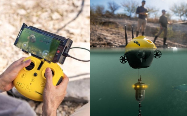 Thanks to this underwater robot, you will be able to share livestreams of your fishing adventures with the world. The F1 Pro relies 4 vectored thrusters for multi-directional movement. It runs on a 4800mAh battery for up to 6 hours. There is also a GPS function to mark fishing spots and return when out of the controller’s range.
