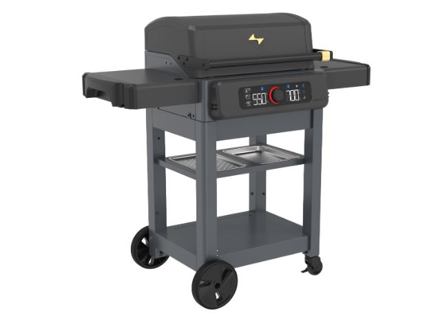 This is the Current Model G Dual Zone Grill: an app connected 110v electric grill that reaches temperatures up toe 700 degrees fast. It is ready to go in 10 minutes and can sear in cold conditions. It has independent cooking zones. You can control this grill using the Current Backyard app. You can monitor and change the temperature wirelessly.