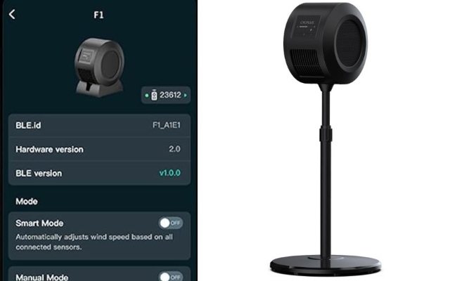 This cycling fan can be put on the ground or mounted on a floor stand. It has a max wind speed of 50km/h. The companion app lets you adjust wind speed manually. This fan is smart enough to remember your settings and paired sensors. It has a noise rating of 45dB. You get a convenient handheld remote for it too.