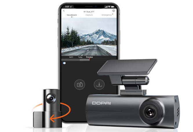 The DDPAI N1 Dash can record to SD cards up to 256GB cards. Its rear camera is 360-degree rotatable. You can use your phone to download emergency video and preview footage. With AI-aided H265 video compression, you can enjoy high quality recordings without worrying about storage.