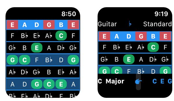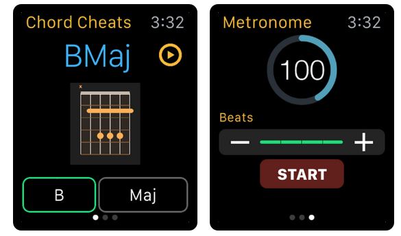 Chord Cheats: a handy app that gives you access to chords on your wrist as well as your iPhone. This app lets you listen to the chords directly. It also has a tone generator and metronome.