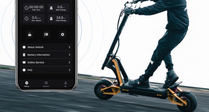 The INMOTION RS has a 0-30mph acceleration of 3.5 seconds. It runs on 11×3.5-inch tubeless tires. What sets apart this ride from other electric scooters is its ability to transform from sports car to SUV or Sedan form. It also has a c-shaped suspension absorber and adjustable hydraulic damping for front and rear to give you a smooth ride. The INMOTION app lets you customize driving mode, turn the light on, and unlock your ride.