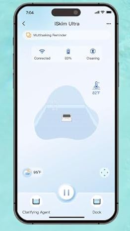 This robot has 7 motors to get around in our pool. It uses an underwater sensor for edge and corner detection. You can use your phone to adjust speed, monitor water temperature, and control navigation. The iSkim Ultra has a total of 20 sensors. It also has 24W solar charging.