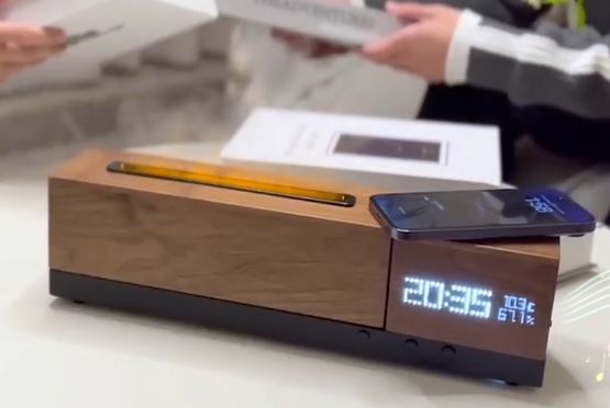 This device has an induction music mode, so you can activate it by simply putting your phone on it. It has a stand that holds your phone in horizontal and vertical mode. It has a display to show time, temperature and humidity. You can find out more on Kickstarter.