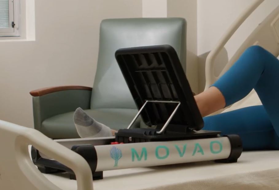 This is the MOVAO Mini In-Bed Leg Press: a neat exercise machine that helps you recover from injuries with in-bed exercises. It is great for people who are recovering from an ACL or PCL surgery. You can also use this under your desk or while sitting in a chair. With an optional gaming sensor, you can turn your rehab into games.