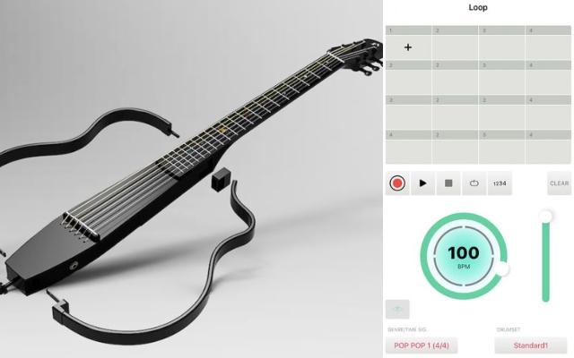 This guitar is ready for real-time recording and livestreaming. It has a solid bamboo construction, measuring 950mm high and 350mm wide. The companion app gives you access to metronome, tuner, drum, and other functions. This guitar works with iOS & Android devices and PCs.