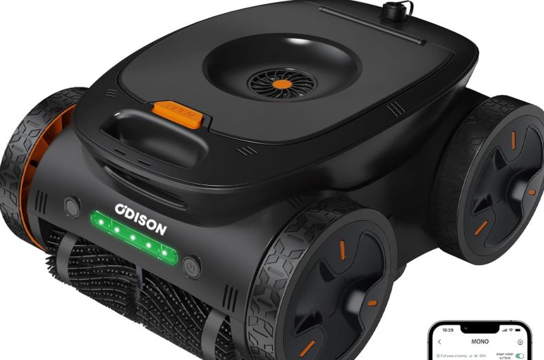 Meet the ODISON Mono S: an app connected pool cleaning robot 45with a 4-wheel drive system that gets the job done without you having to break a sweat. It can climb 90-degree walls and runs up to 3 hours on battery. This robot has WiFi and Bluetooth connectivity. It has an ultrasonic navigation system to adapt to pools of all shapes. It is smart enough to switch to bow-shaped cleaning for U-shaped pools.