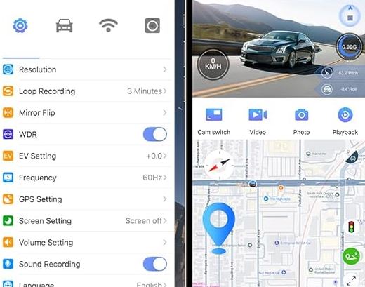 This dashcam works with the RoadRec app. It has built-in GPS to track route and location. Its IMX678 image sensor has a 1/1.8 lens with high dynamic range for low noise and motion blur. The T1 has 5G WiFi connectivity. It supports loop recording.