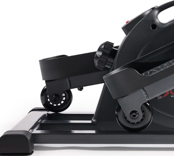 This mini elliptical has a digital monitor that shows your real-time speed, time, calories burned, and distance. It is compact enough to fit under your desk or in a closet. This model weighs 18.9lbs. It has a convenient handle for moving it around.