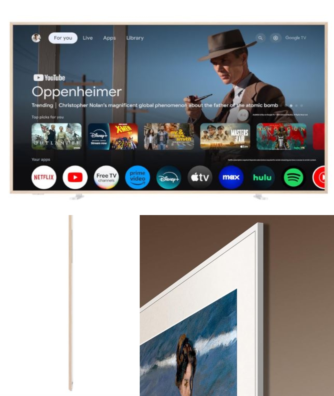 This model is a Google TV but works with Alexa and Apple devices thanks to AirPlay 2 support. It also comes with a convenient voice remote. This TV not only displays your movies and TV shows but also AI art. It has a gorgeous off-white bezel and a light wood frame. It mounts flush to the wall seamlessly.