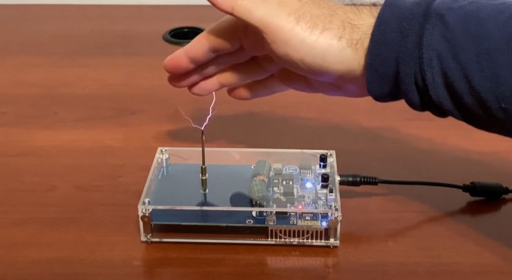 Tesla coils are wonderful physics toy that put on an electric show. They may sound scary but many smaller models are safely touchable. This tiny Bluetooth tesla coil is one of the smallest ones we have seen. It has a transparent cover, so you can see the electronics inside. It also has knobs to adjust frequency and arc size.