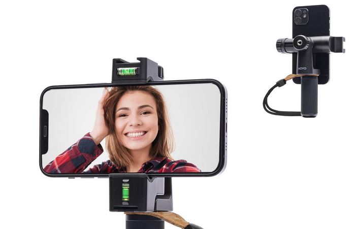 Movo PR-3: a rotating smartphone grip handle for vertical and horizontal videos. It has a cold shoe mount for lights and microphones. It has 3 x 1/4″ thread mounts.