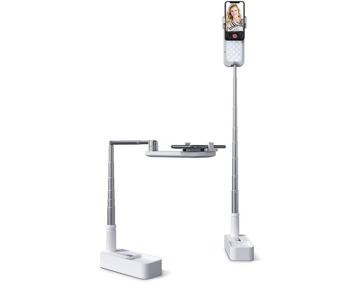 Viozon AP-V6: a livestreaming and vlogging phone stand that can hold devices from 3.5 to 6.1″. It has a LED light with 7 effects. Its height is adjustable to 49.2″.