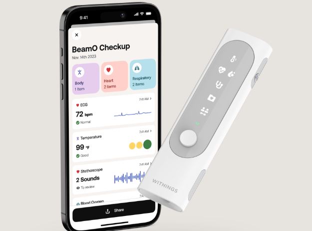 BeamO can detect irregular heartbeat through your fingers. Its oximeter quantifies your blood oxygen level. It also lets you listen to your heart and lungs. It lasts up to 8 months on battery. It has Bluetooth and WiFi connectivity. Expected to debut in the summer of 2024.