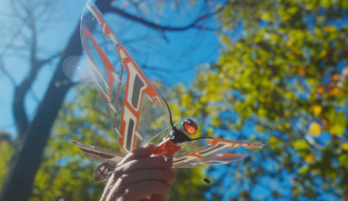 Meet the X-Fly: a new app controlled biomimetic flying creature by the makers of Bionic Bird and MetaFly. It soars, dives, and flutters like real birds and insects. You can control it by tilting your phone or using the touchscreen. An optional joystick is also available for it (X-Play). You can fly this indoors and outside. X-Fly has max speed of 12mph with max range of 330ft.