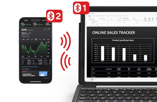 The keyboard supports multi-device pairing, so you can make a switch fast. It is easily detachable and has a convenient Apple Pencil holder. It has 84 keys. Rugged Book also works as a stand with multiple viewing angles. The keyboard has backlit keys, so you can type in low light conditions.