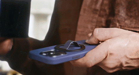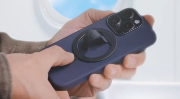 This is the Aeroloop: a thin MagSafe grip, measuring 2.4mm, that helps you handle your phone more comfortably. It has integrated horizontal stabilizers to roll sideways for selfies. You can even use it as a stand for hands-free viewing. It has 5lbs of locking force. You can stick your phone to any surface.