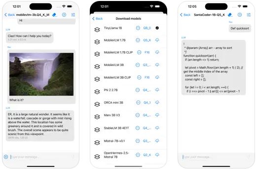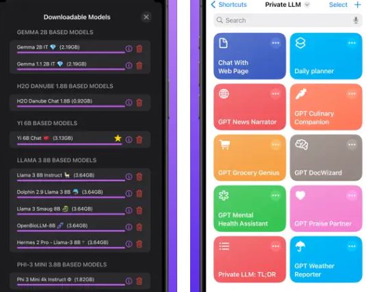 Private LLM: brings an offline AI assistant to your device. It works with Phi-3, Mistral 7B, Llama 3.2 3B and StableLM 3B. It supports Siri and Shortcuts integration.