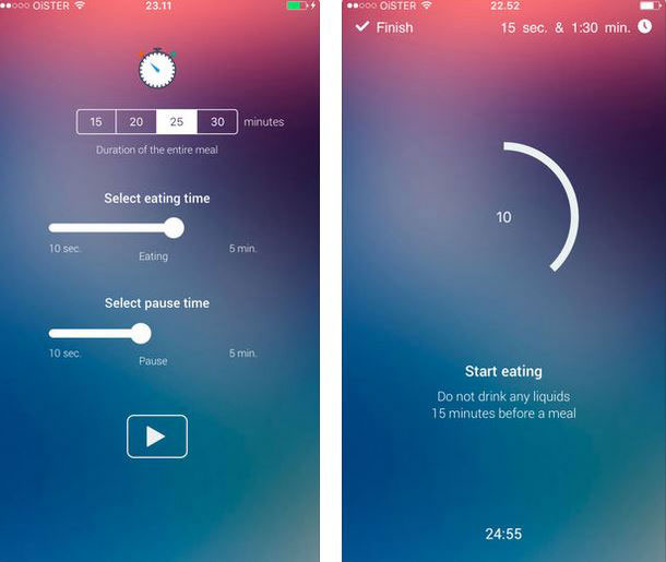 The app guides you through your meal with breaks. It uses sounds and vibrations to let you know when to take a break or stop eating. Like what you see? You can download the app for under $2 at this time.