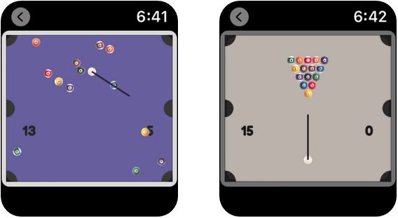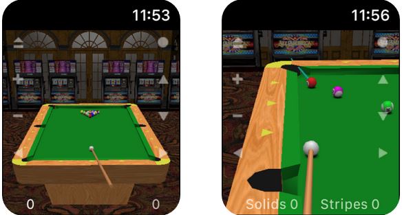 Vegas Pool Watch: this Apple Watch pool game has 4 opponents for you to choose from. It lets you play straight pool, 8 ball, and 9 ball games. It has 3D mode with tilt and zoom.