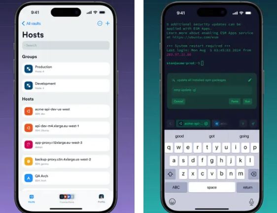 iTerminal: a SSH Telnet client for iPhone and iPad. It lets you export and import your server info easily. This app works with Bluetooth keyboards. It keeps track of recent tasks too.