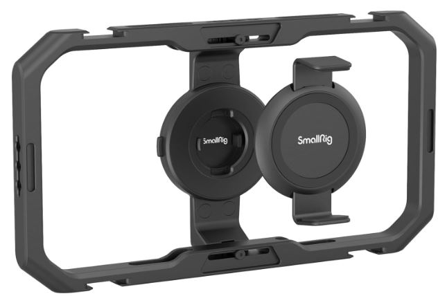 SmallRig iPhone 16 Video Cage: a MagSafe compatible filmmaking rig with cold shoe mounts and 1/4-20 threaded holes that let you attach lights, microphones and handles. It has a clamping mechanism for easy lateral adjustment.