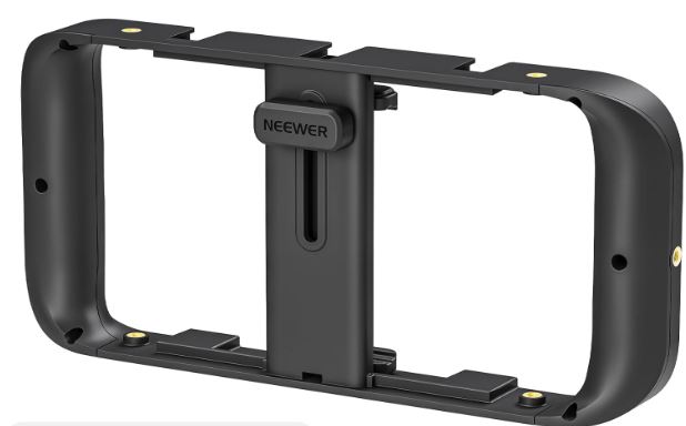 NEEWER Video Rig: a stabilizer cage with cold shoe and 1/4-20″ threads. It is ready for vertical and horizontal shooting. This cage has 5 shoe mounts and 6 x threaded holes. It features an adjustable spring loaded clamp.
