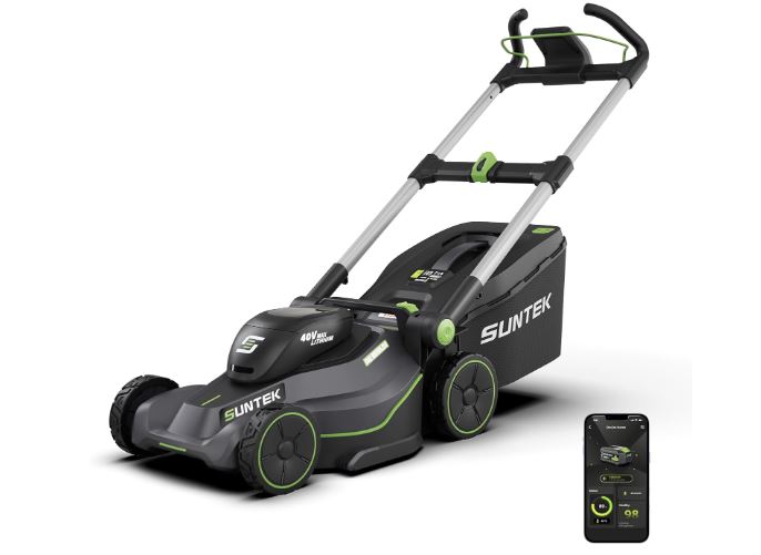 Suntek Smart Lawn Mower: an iPhone compatible electric mower with 18-inch width. It has eco, intelligent and power modes. Its cutting height is adjustable from 1 to 2.95″. You can check battery level, temperature, and status on your phone.