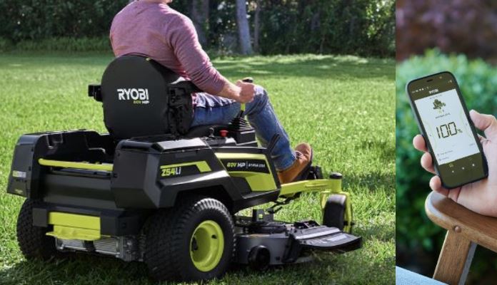 RYOBI 80V HP 54-inch Electric Riding Mower: an app connected riding mower that can handle 4 acres per charge. It has adjustable height from 1.5 to 4.5″ and max speed of 8mph. Its app lets you monitor charge time and battery life.