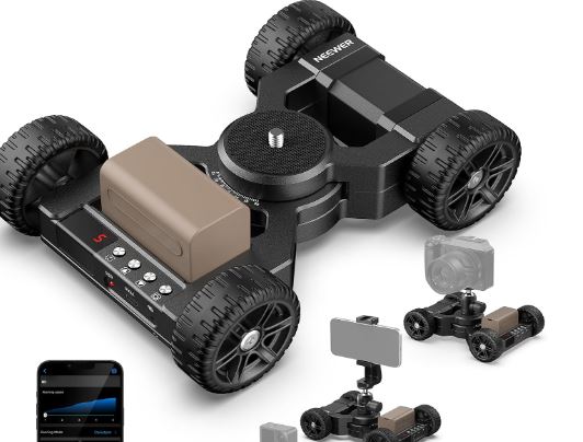 Neewer DL400: a Bluetooth connected dolly with 5 speeds for you to choose from. It can carry cameras up to 3kg. It is great for curved and straight shots.