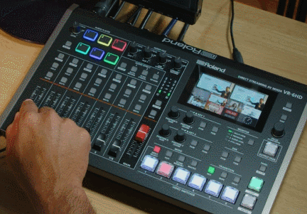Roland VR-6HD: a streaming AV mixer with iPad control. It lets you transmit 2 livestreams at up to 1080p/60fps. This mixer has 6 x 1080p HDMI inputs and 5 total outputs.