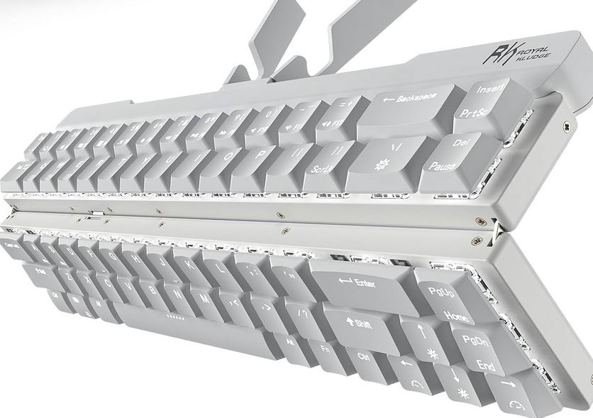 RK F68: a foldable mechanical keyboard with a built-in holder. It has a low profile with brown switches. It can connect to 3 devices at the same time. The keys are backlit.