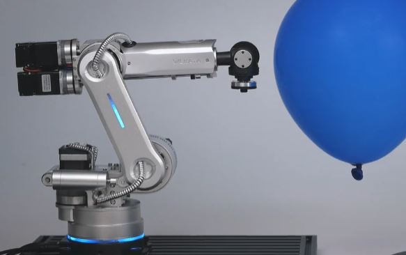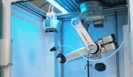 This is the HARO380: an industrial robot arm with a footprint of 22x25x38cm that easily fits on your desk. It has payload capacity of 500g. You can mount it to the ceiling or wall. This robot has magnetic end effectors. It can be programmed using a visual interface.