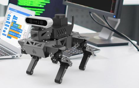 The ROS Pi Pro has a total of 13 degrees of freedom. It has a 3D depth camera, IMU sensor, TOF LiDAR, and a ROS Melodic system. You can control this robot with your iPhone or Android device or a joystick. Python programming is supported. This robot dog also has an augmented reality QR code tag detection function.