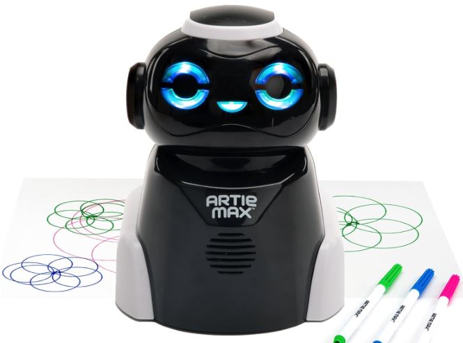 Artie Max: a coding and drawing robot with 3 interchangeable markets. It can be programmed in Blockly, JavaScript, Python, and C++. It works with a WiFi connected tablet.